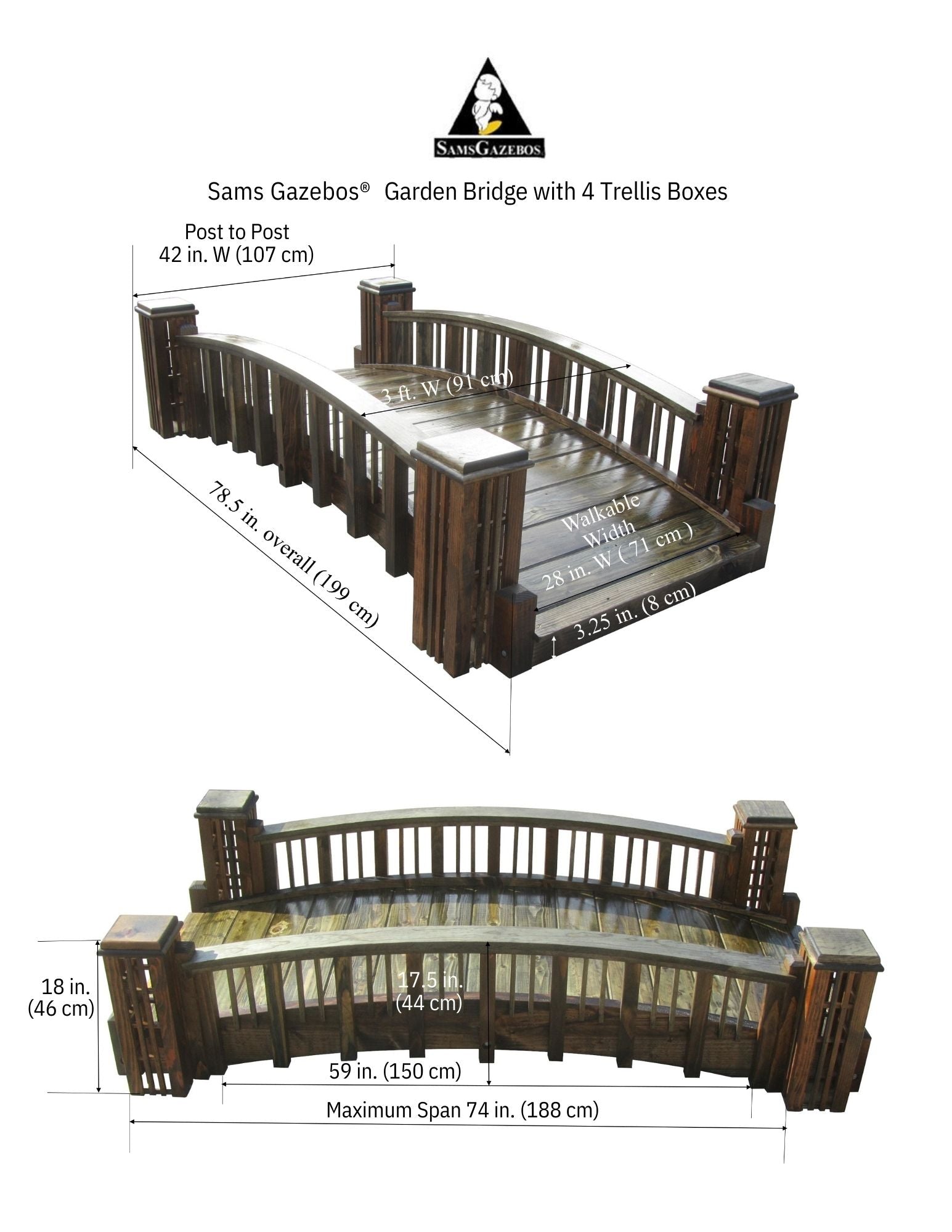 - Bridge Dimensions excluding trellis boxes : 78.5 in. long x 3 ft. wide x 17.5 in. tall (199 cm x 91 cm x 44.5 cm)
