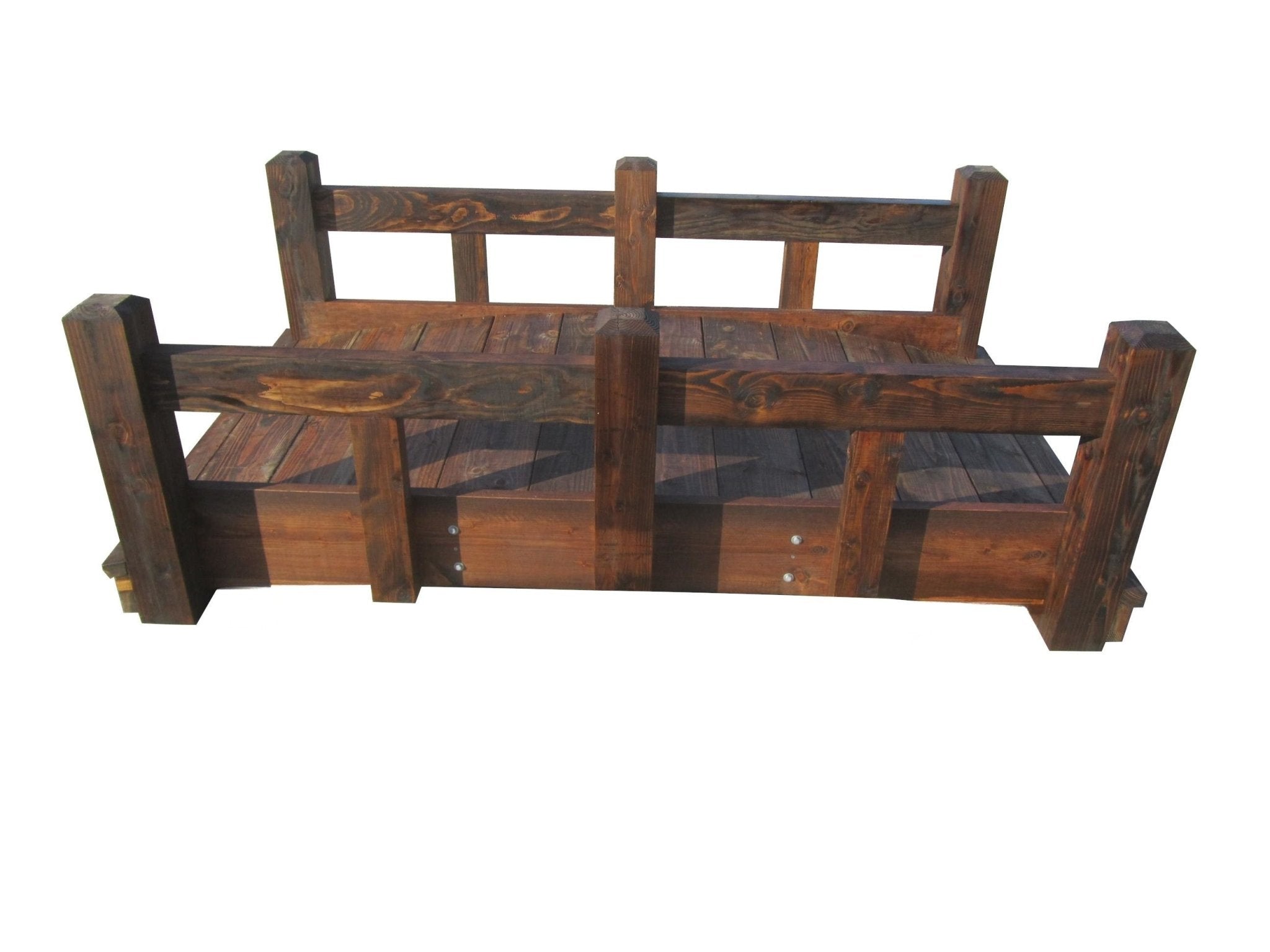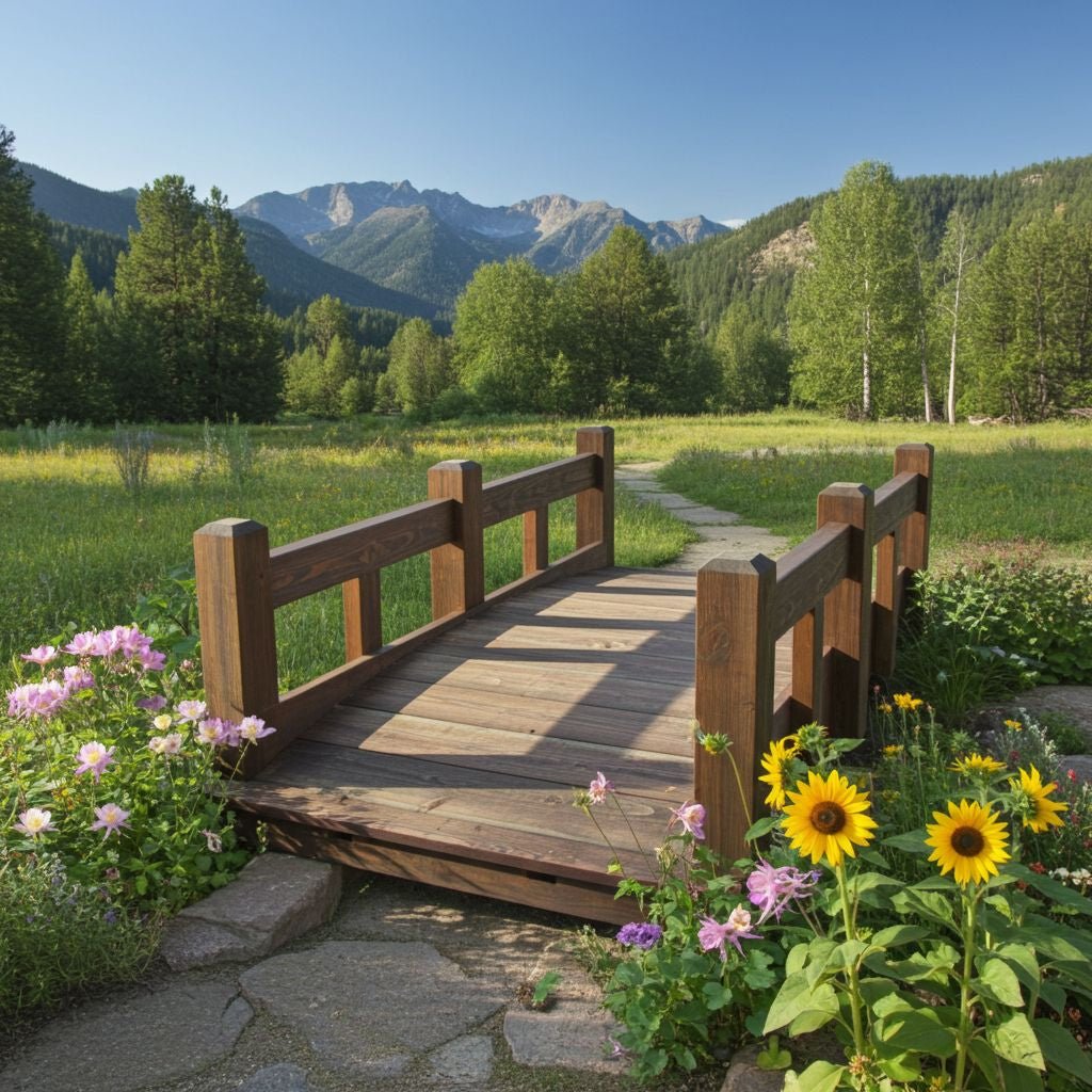 Inspired by Colorado's pristine Rocky Mountain landscape and rustic horse-country lifestyle, this handcrafted wooden bridge captures authentic mountain charm. Featuring substantial 6 x 6 support posts and sturdy 2 x 8 curved flooring, it delivers both durability and comfort underfoot. Bold split-rail railings on 2 x12 profiles provide classic appeal and safety. The 42-inch (107 cm) walkable width makes it ideal for crossing small creeks or ditches while serving as a striking focal point in any garden setting.